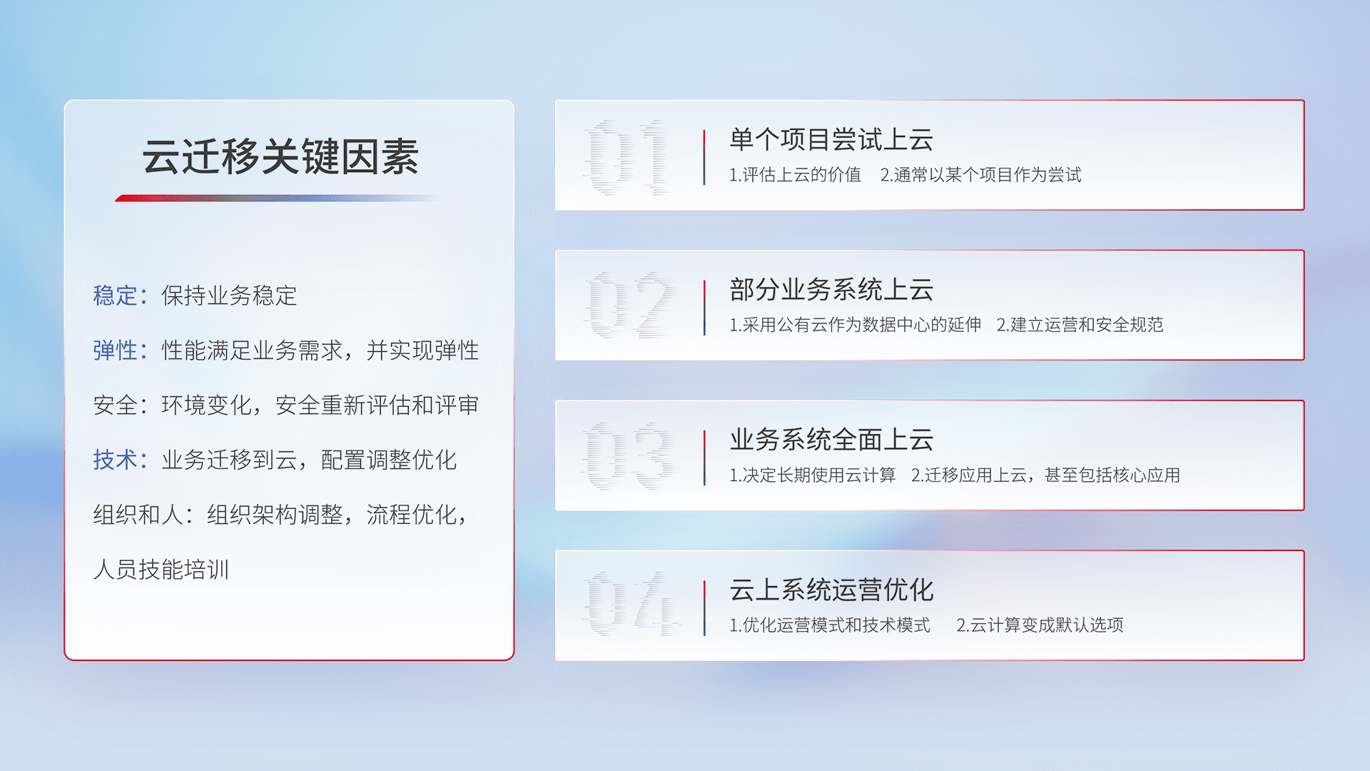 结合实际业务,,,从规划设计、、、云平台选型、、云原生改造、、、、数据迁移、、集成交付,,迁移全过程为客户识别最佳上云路径,,,,做好风险识别管理,,,设计网络架构、、身份权限、、安全审计合规、、操作审计、、、日志审计、、、、监控告警策略、、、、多站点容灾设计等,,,,对云上基础设施进行整体规划,,,,提升IT治理水平,,,,以满足弹性、、、、高可用、、、高性能的需求。。。